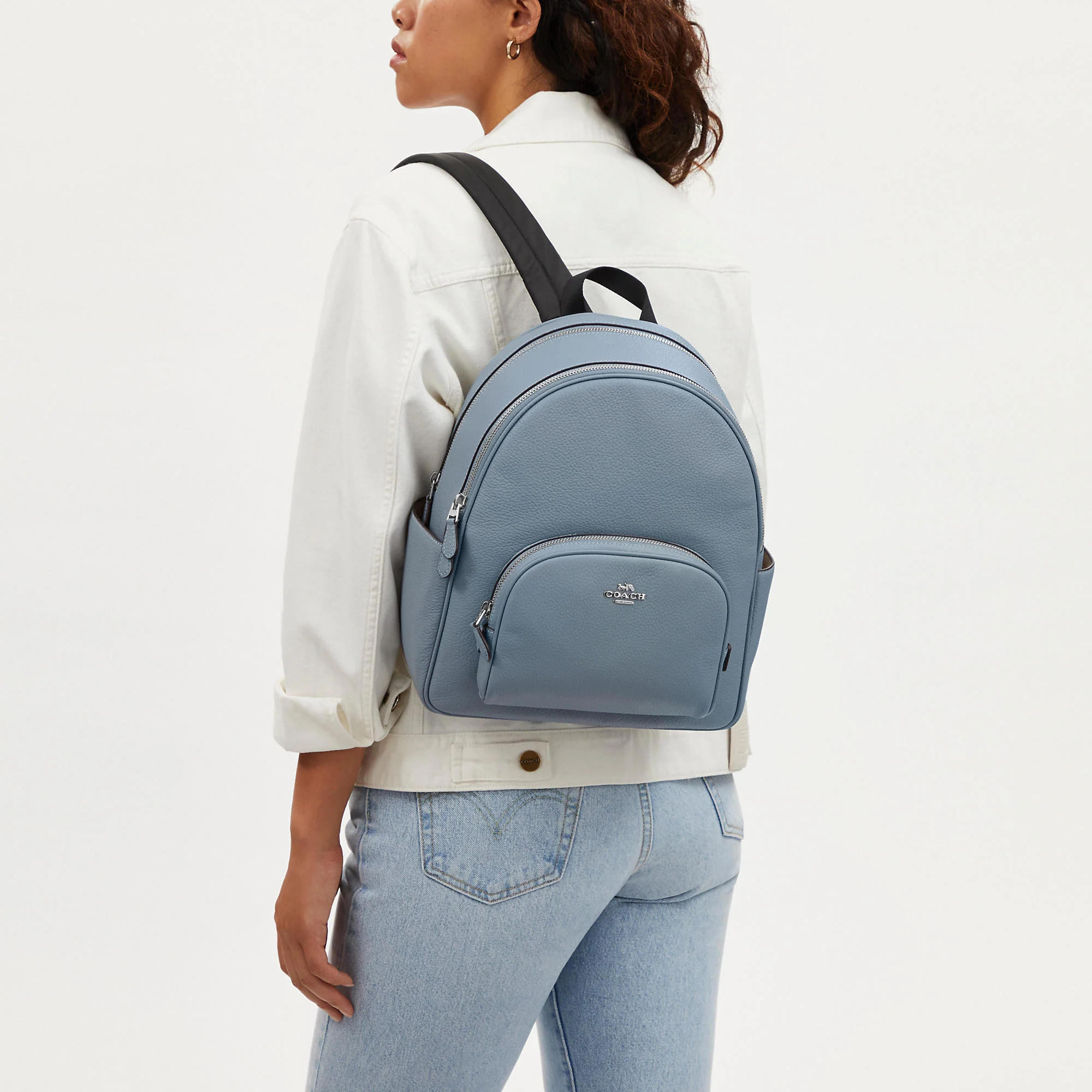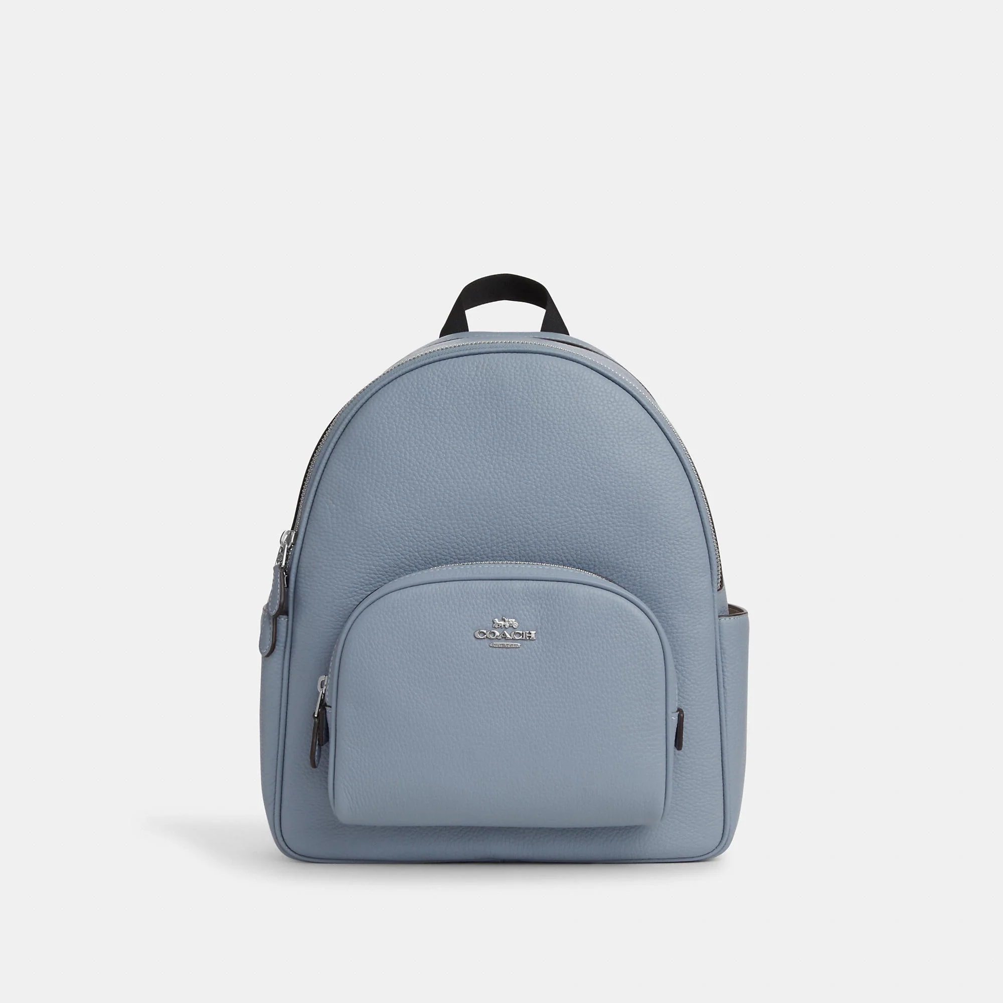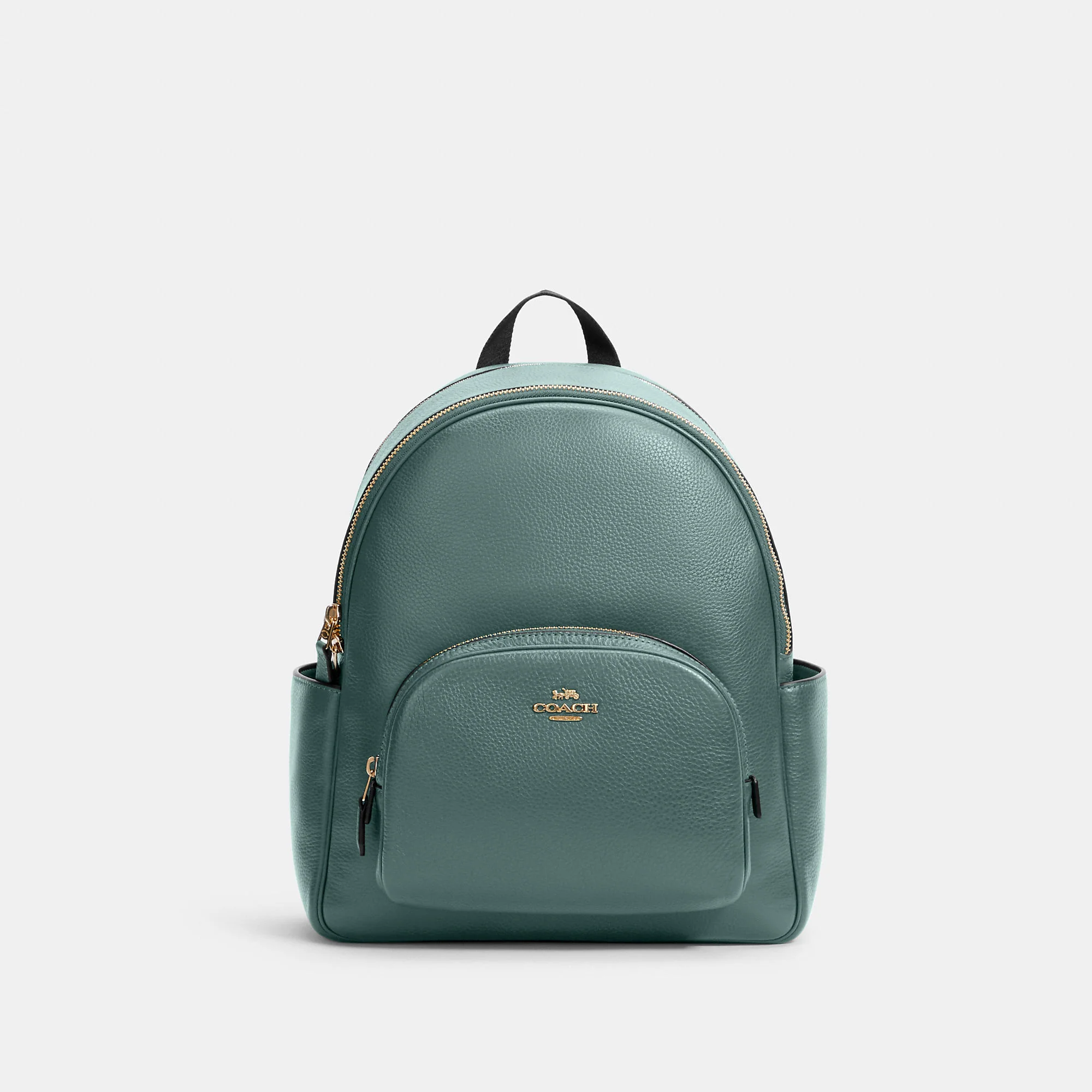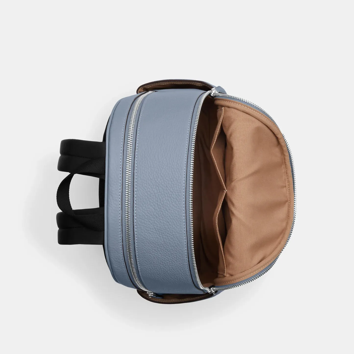 Refined pebble leather Inside zip and multifunction pockets Double zip closure fabric lining Handle with 2 1/4 drop Outside zip pocket Adjustable shoulder straps 10 3/4 (L) x 12 1/2 (H) x 4 3/4 (W) Style No. 5666 | Outlet Court Backpack - Grey