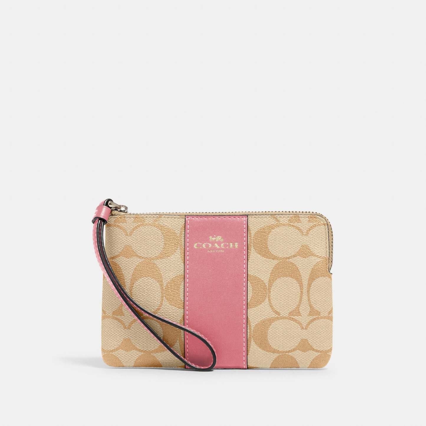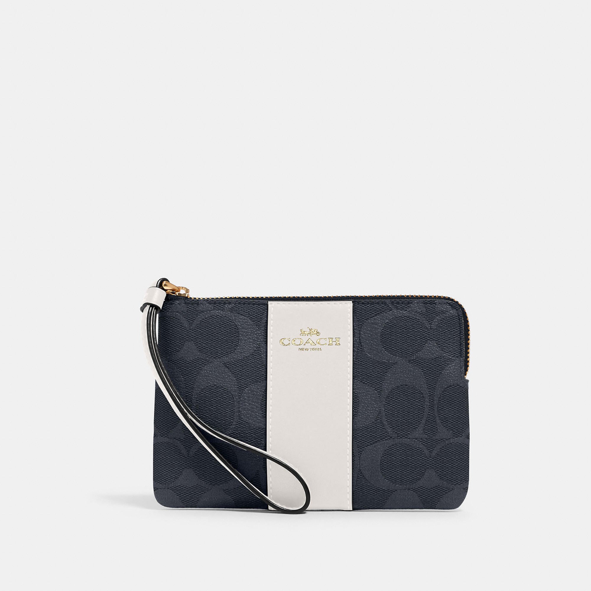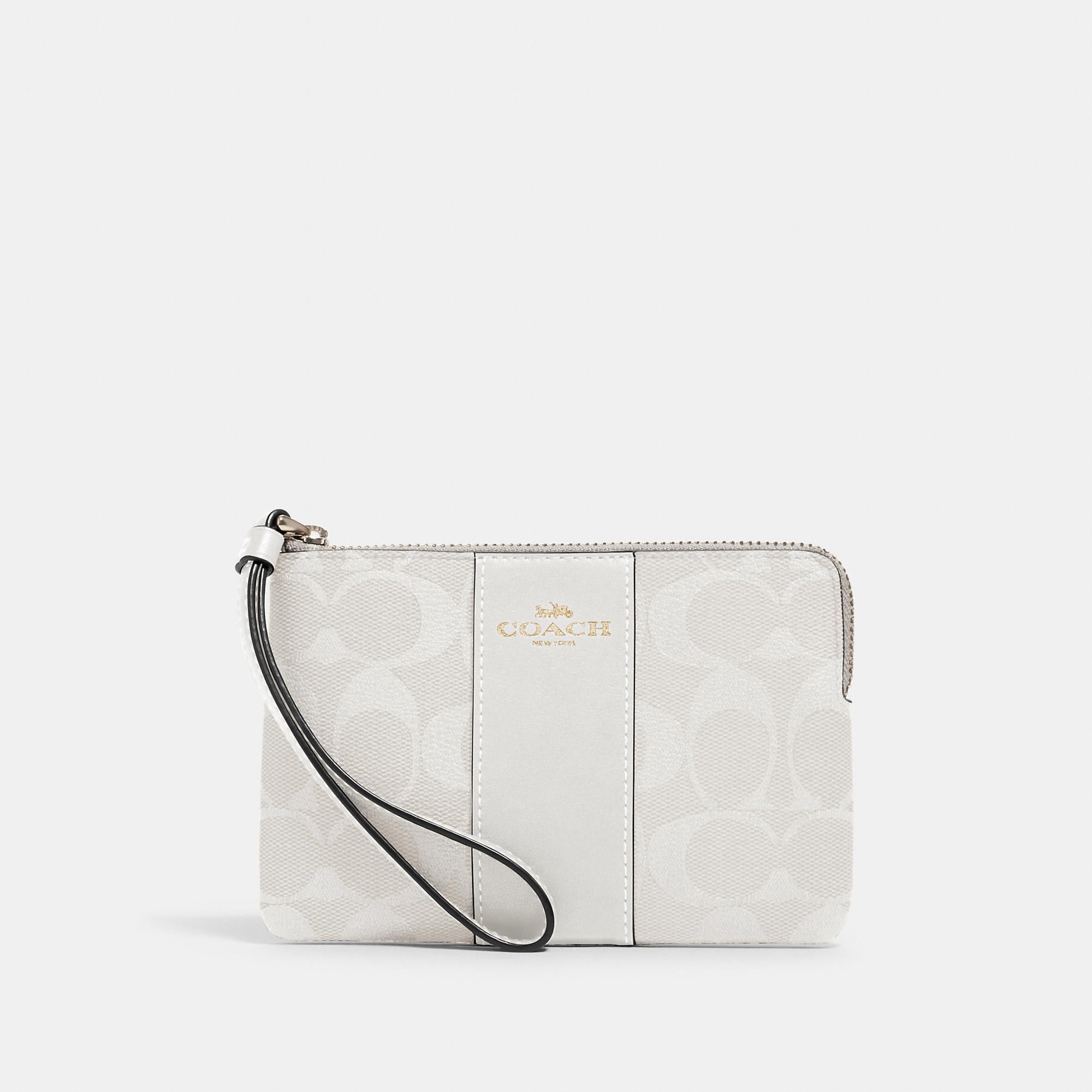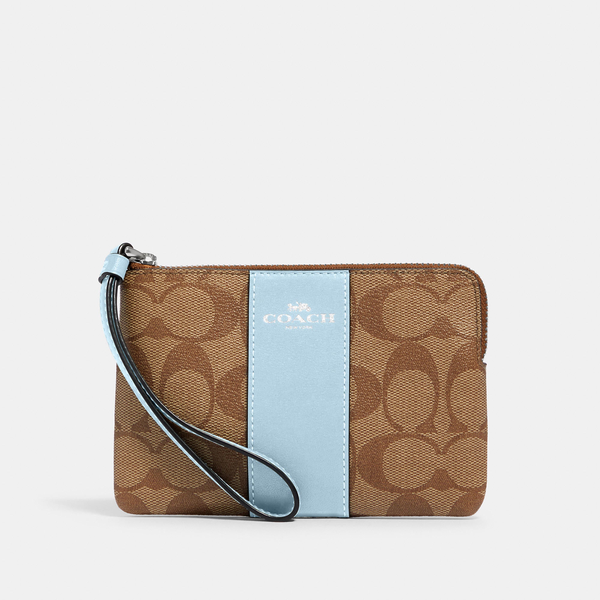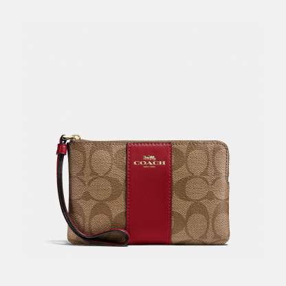 Signature coated canvas with crossgrain leather details Two credit card slots Zip-top closure fabric lining Wrist strap attached 6 1/4 (L) x 4 (H) x 1/2 (W) Style No. 58035