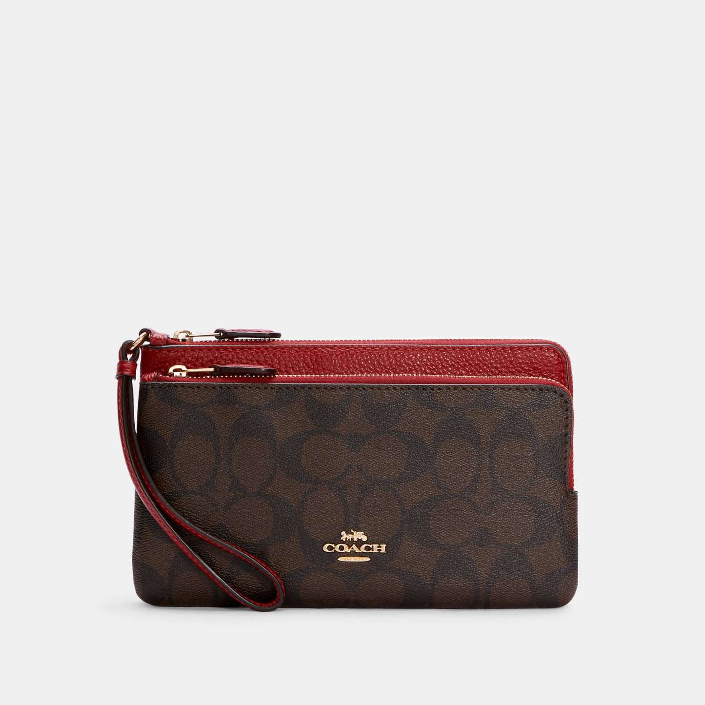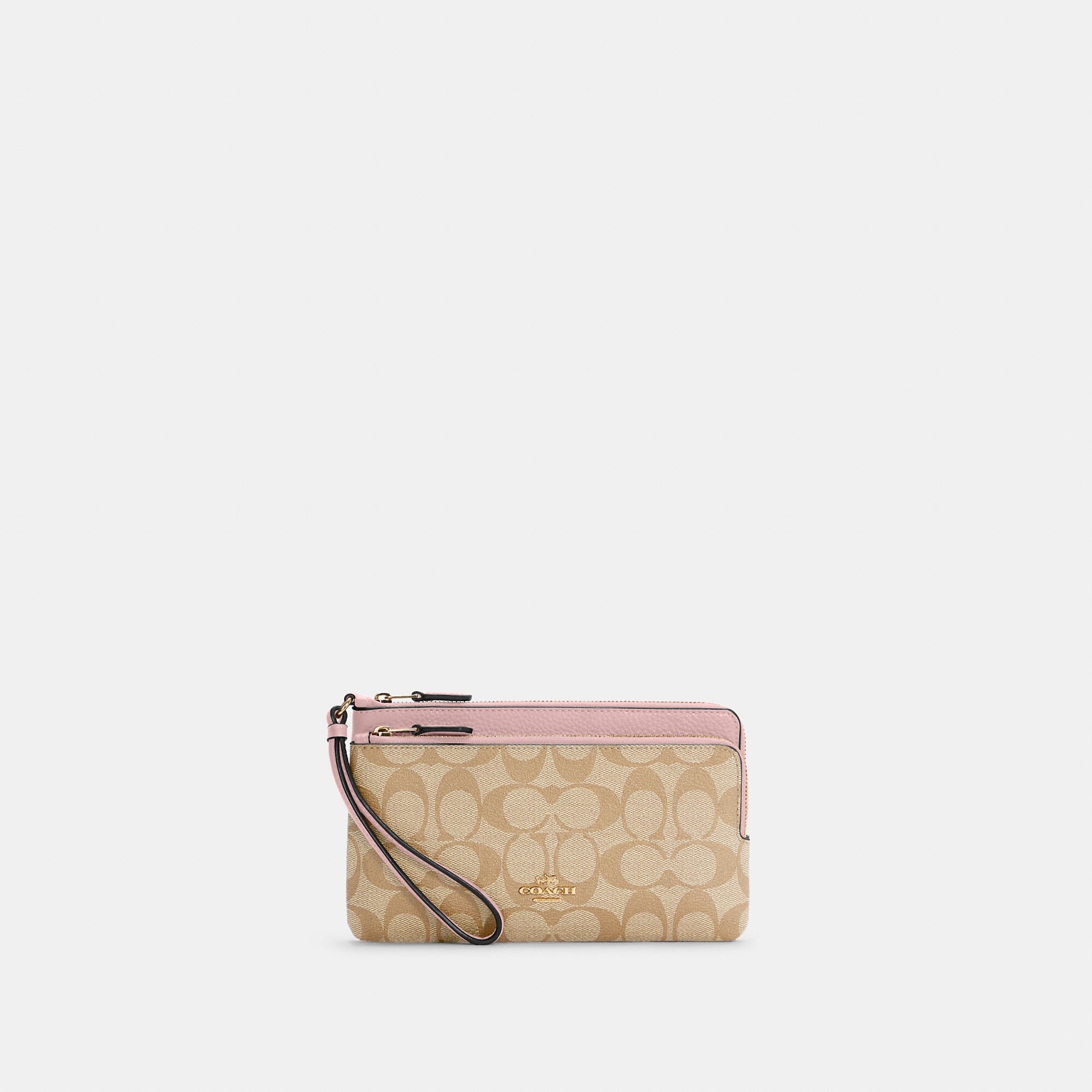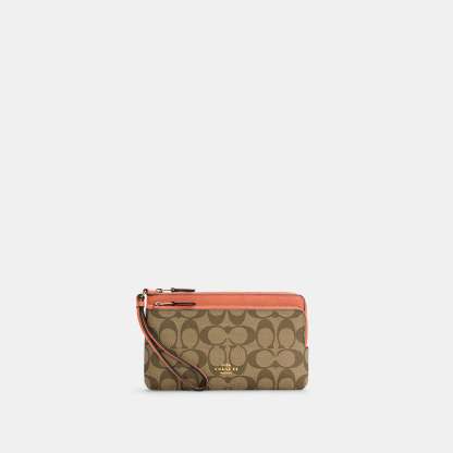Signature coated canvas and refined pebble leather Eight credit card slots Inside open pockets Double zip closure fabric lining Wrist strap attached 8 (L) x 4 3/4 (H) x 1 (W) Fits all phone sizes up to an iPhone X and Samsung S7 Edge Style No. C5576